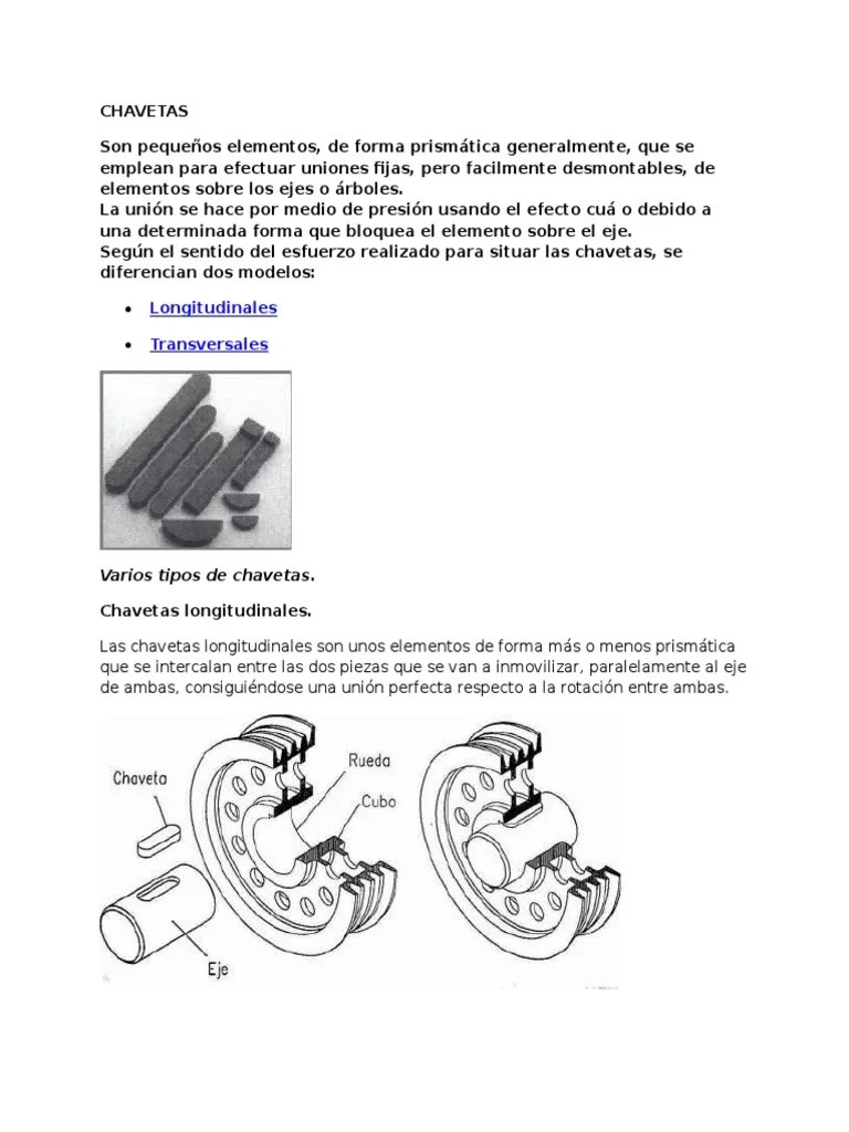 Asegura el mejor centrado del eje y la pieza rozante, permitiendo realizar uniones inmóviles, como también, uniones resbaladizas. 04.10.2012 · a true chaveta costs in the neighborhood of $40, though you can make one from an old saw blade, if you have the shop tools to do so. Tais se dividem em … Asegura el mejor centrado del eje y la pieza rozante, permitiendo realizar uniones inmóviles, como también, uniones resbaladizas. 02.01.2015 · na verdade, a chaveta desempenha as duas funções. Alguns autores classificam a chaveta como elementos de fixação e outros autores, como elementos de transmissão. Ligação por chaveta aplicável para articular o veio e o cubo. Na verdade, a chaveta desempenha as duas funções. 29.08.2016 · chaveta a chaveta tem corpo em forma prismática ou cilíndrica que pode ter faces paralelas ou inclinadas, em função da grandeza do esforço e do tipo de movimento que deve transmitir. Las chavetas prismáticas se colocan en alojamiento de chavetas de tal modo que, entre la cara ….. Além disso, estes compostos são utilizados, embora não …