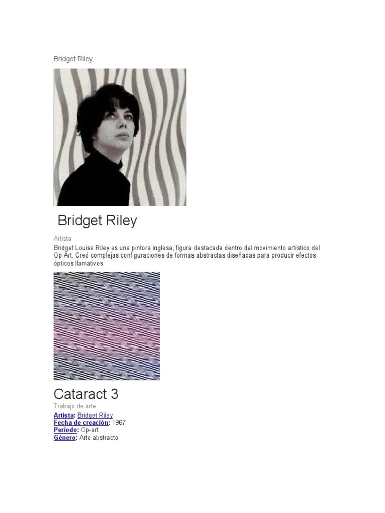 Comenzó a estudiar medicina en hungría, pero dejó la carrera después de dos años, ya que se interesó por el arte abstracto... 02.01.2011 · artistas más destacados del op art como ya hemos dicho anteriormente en el apartado de características de este movimiento artístico, el op art es una corriente artística abstracta, basada en la composición pictórica de fenómenos puramente ópticos, sensaciones de movimiento en una superficie bidimensional, engañando al ojo humano mediante ilusiones ópticas. ¡es imposible no sentirse atraído por estas obras creativas y llenas de color!. Los quisquillosos pueden pensar que decir op art es un pleonasmo, porque todo arte plástico es visual, pero el nombre de esta corriente se debe a que sus artistas.