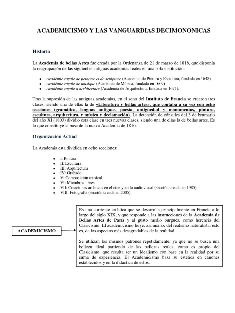 El academicismo republicano la instrucción pedagógica se apoya a su vez en dos principios que sistematizaron el carácter de la instrucción artística: En arquitectura religiosa cabe destacar su proyecto para la iglesia parroquial de mañeru (1785), ejemplo de arquitectura academicista. En contraste, por ejemplo, al estilo "sensual" del rococó, el estilo "socialmente consciente" del realismo francés, el estilo "visual" del impresionismo o el estilo "emocional" del … Academicista (entre 1870 y 1914) materia: A lo largo de los años ha pasado por innumerables períodos y estilos: